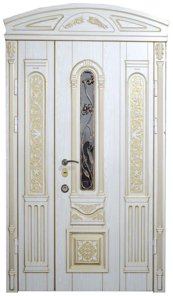 Парадные двери относятся к изделиям премиум-класса. Изготавливаются такие модели из металла толщиной не менее 2,0 мм, конструкция усиливается ребрами жесткости. Основной фактор, делающий парадные двери таковыми – их внешняя отделка. Для декора этих дверей, как правило, используют массив дуба, ясеня или сосны, натуральный шпон, корабельную фанеру, МДФ-панель, покрытую атмосфероустойчивой пленкой Винорит (VINORIT). Декоративные вставки из антивандального стекла, с применением элементов ковки, рисунок, который будет сочетаться с рисунком решеток на окнах, придаст коттеджу неповторимый внешний вид. Можно декорировать дверь витражным узором – и ваш дом заиграет яркими красками. По конструкции парадные двери могут быть как одностворчатыми, так и двустворчатым. При достаточной высоте проема, можно изготовить входную группу с декоративной вставкой сверху – прямоугольную или в виде арки. Терморазрыв в конструкции парадной двери сохранит тепло в доме, и предотвратит промерзание и кондедсирование двери в холодное время года, при этом не требуется обустройство в доме холодного тамбура.